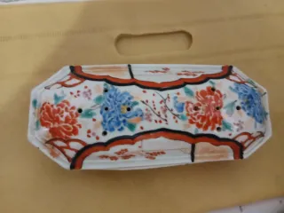 Jabonera de cerámica con un diseño floral pintado a mano. - Diseño octogonal. - Motivos florales en tonos rojos y azules. - Borde decorado con detalles en rojo y negro. 18x8x6