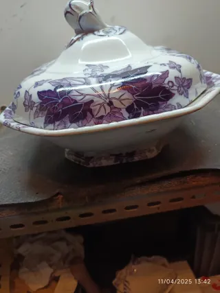 Elegante sopera de porcelana china con un diseño floral en tonos morados. Perfecta para servir tus platos favoritos con un toque de distinción. - Diseño floral morado. - Material: Porcelana. - Incluye tapa.