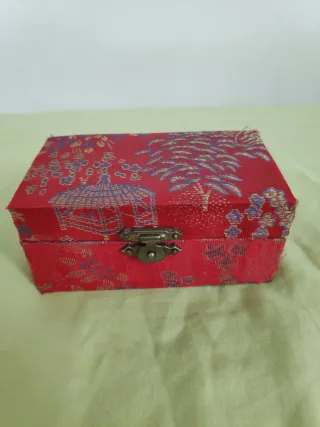 -Preciosa reproducción de antigua caja china.Hecha de madera recubierta de piel color burdeos y detalles de niños jugando en dorado -Forrada de papel con letras chinas - Cerradura metálica frontal. -Mide 24 cm largo ,por 10cm alto y 9 cm ancho