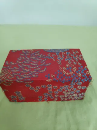 Estuche con Bolas Chinas de Baoding. Caja de tela que contiene un par de bolas de Baoding chinas, también conocidas como bolas de salud o meditación. Son esferas de metal huecas y sonoras, utilizadas para ejercitar las manos y los dedos. Se emplean para la relajación, meditación y concentración, estimulando puntos de acupuntura en la mano. Se hacen girar en la palma de la mano, lo que se cree que estimula puntos de acupuntura y mejora la circulación sanguínea. Las bolas contienen un mecanismo interno que produce un sonido de campanilla agradable y relajante. El exterior de las bolas está esmaltado con símbolos de salud.