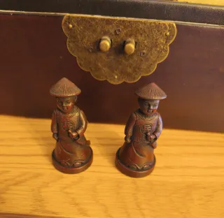 Tablero de ajedrez antiguo con un diseño oriental único. El interior de la tapa está decorado con caligrafía china. - Tablero a cuadros negros y dorados. - Decoración con caracteres chinos en la tapa. - Ideal para coleccionistas.