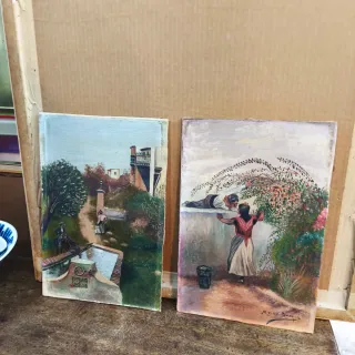 Conjunto de dos pinturas firmadas antiguas sobre madera, datadas del siglo XVIII. Representan escenas costumbristas. Pinturas sobre tabla. Los dos cuadros 60€. Un cuadro 35€. Medidas 22 cm. De ancho x 32 cm.