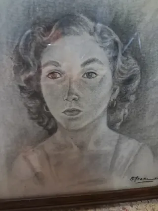 Cuadro vintage con un retrato a lápiz de una mujer. La obra está enmarcada y lista para colgar. - Dibujo a lápiz detallado. - Marco de madera. - Firma del artista visible.