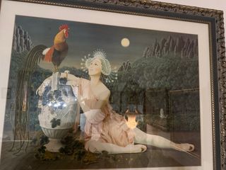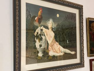 Litografía original. - Obra de arte enmarcada. - Representación de un gallo y una figura femenina en un paisaje onírico.