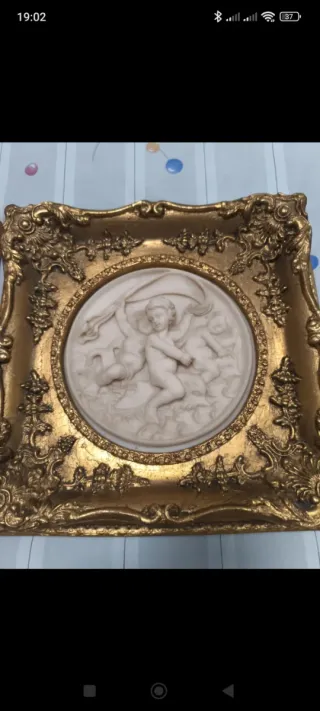 Oferta liquidacion Precioso cuadro antiguo con relieve de ángeles y marco dorado. De escayola o yeso - Figuras de ángeles en relieve. - Detalle de tela azul. - Marco con ornamentación dorada.