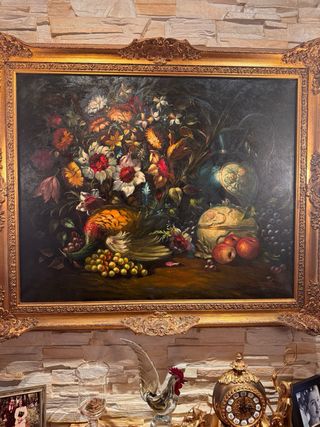 Precioso cuadro pintado al óleo con una escena de bodegón. - Representa frutas como uvas, manzanas, melocotones y naranjas. - Incluye dos jarrones decorativos. - Marco dorado y negro.