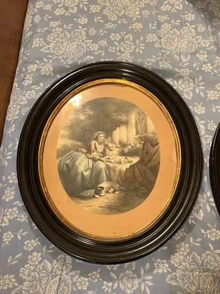 Precioso cuadro antiguo con una escena familiar y un perro. El marco es ovalado y de color negro. Precio negociable Tengo dos pero este es el precio individual aunque si le interesa los dos le hago precio especial - Imagen con detalles de época. - Marco negro con borde dorado.