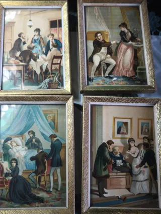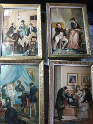 Conjunto de cuatro cuadros antiguos con escenas de época. - Marcos dorados. - Ilustraciones detalladas. - Ideal para coleccionistas.