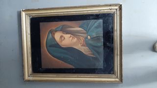 cuadro virgen muy antiguo marco en madera revestido en yeso y dorado.. tiene varios defectos por su antigüedad . El cristal tiene una rotura en la parte inferior izquierda. El cristal está acabado en un marcó negro pintado en el reverso. sería fácil de reposición y la imagen de la virgen es una lámina medidas.... ancho...59 cm alto.......79 cm grueso marco..4 cm .