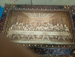 Réplica del famoso cuadro La Última Cena con un marco decorativo. - Representación en relieve de la obra. - Marco con detalles ornamentales. - Inscripción en latín en la base.