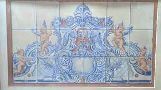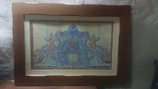 BAJADA DE PRECIO. CUADRO de lamina imitación a composición de azulejos con imagen de ángeles. Se ha arañado de forma accidental. Ver fotos Marco en madera. Medidas en cm 90x64