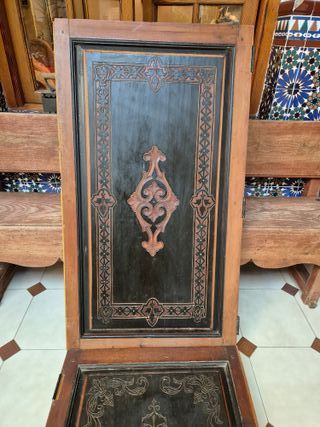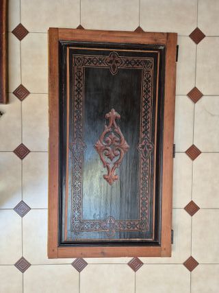 Puertas de armario de finales del siglo XIX con diseño decorativo. - Madera maciza labrada. - Panel central oscuro con motivos florales en relieve y color más claro. - Posible uso como adorno de pared, cuadro, tablero de mesa, etc. - Precio de cada puerta: 30 € Medidas: 66,5 cm x 66,5 cm. Peso unos 10 kg - Signos de uso y desgaste dada su antigüedad. Ver fotos y solicitar la información que necesite
