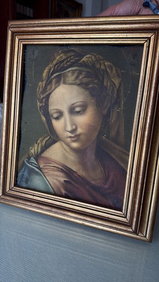 Pintura antigua con firma. - Marco dorado con detalles. - Representación de una mujer con un pañuelo en la cabeza y una concha marina.