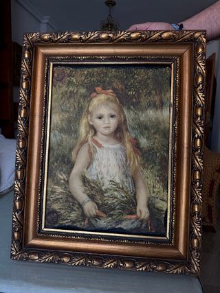 Precioso cuadro antiguo con una escena de dos mujeres asomadas a una ventana. Ideal para coleccionistas o amantes del arte clásico. - Es una lámina. - Marco dorado con detalle trenzado. - Representación detallada de las figuras y el entorno. - Las medidas son 33*40