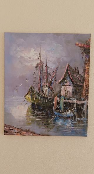 Preciosa pintura al óleo de estilo antiguo que representa una escena portuaria con barcos. Es una pieza única y llena de encanto.