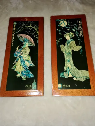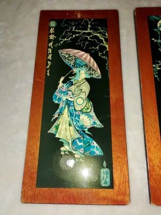 Conjunto de dos cuadros decorativos de estilo oriental. Presentan escenas con figuras femeninas y detalles artísticos. - Marco de madera. - Diseño con fondo negro. - Motivos florales y celestes.
