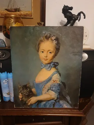 Pintura al óleo de una niña con un gato, inspirada en el estilo de Perroneau. La obra presenta una paleta de colores suaves y un retrato detallado. - Estilo: Clásico - Técnica: Óleo sobre lienzo - Motivo: Retrato infantil con animal