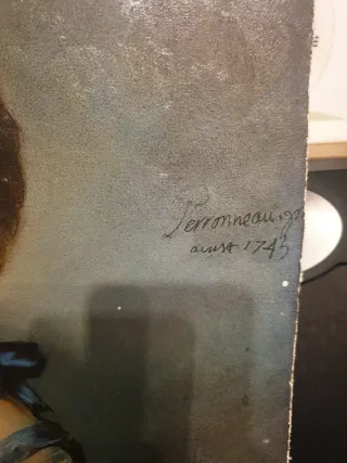 Este es un cuadro antiguo con un marco dorado. Gran tamaño 180cm x 120cm - Marco con detalles ornamentales. - Escena interior con figuras y chimenea.