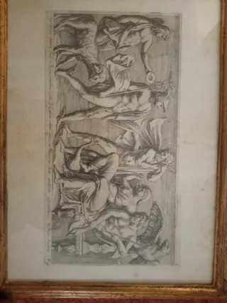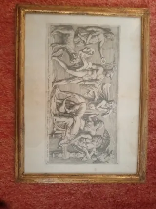 Antiguo grabado de figuras mitológicas, datado en el siglo XVII. Una pieza de colección con gran detalle. MEDIDAS 41 X 31 cm, - Representación de figuras clásicas. - Marco dorado incluido.