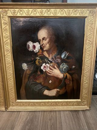 Par de cuadros de época, datados entre los siglos XVII y XVIII. Representan figuras con arreglos florales. Marcos de epoca - Marco dorado con detalles ornamentales. - Pintura al óleo sobre lienzo. Precio indicado por la pareja