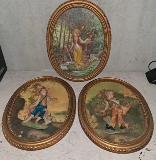 Conjunto de tres cuadros antiguos de estilo Imperio, de origen italiano. Cada pieza presenta una escena detallada con figuras infantiles. - Marco dorado con relieve. - Representaciones de niños en entornos naturales. - Técnica mixta con relieve. - Años 50.