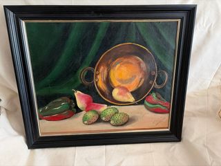 Pintura al óleo sobre lienzo de un bodegón con frutas y un cuenco de cobre. - Representación de peras, pimientos y higos. - Tonos cálidos y verdes intensos. - Marco negro con detalles dorados. -necesita una pequeña restauración debido a la antigüedad que tiene la pintura, ya que tiene más de 60 años -El pintor que firma la obra es Vicente plódema de cámara