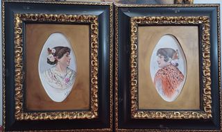 Conjunto de dos cuadros decorativos sobre bandeja de porcelana Pickman frmados muy antiguos enmarcados Medidas exteriores 48x58 Medidas interiores 30x16 Paspartou 27x37 - Representación de mujeres con mantillas y flores. - Marco con detalles dorados y negros.