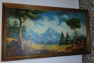 Gran cuadro al óleo sobre lienzo que representa un paisaje de montaña con un ciervo. - Pintura al óleo. - Lienzo. - Marco incluido.