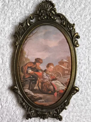 Precioso cuadro antiguo con marco de metal y lienzo en tela. Medidas: 21 x 12 Made in Italy Marco ovalado con detalles ornamentales y pintura de figuras con escenas invernales en tela. Hago envíos.