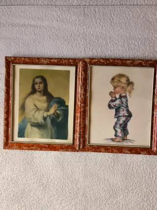 Conjunto de dos cuadros antiguos con marcos decorativos. Medidas: 29,59 x 24 Marco de madera con dibujos ornamentales y cristal de vidrio. - Un cuadro representa a la Inmaculada Concepción. - El otro cuadro muestra a una niña rezando. Están en perfecto estado. Siempre colgados en la habitación de la abuela y ahora que ha pasado a ser la habitación 🛏️ de la "suegra" ha dicho que quitemos eso de ahí. Vamos que quiere darle otro aire. Precio por las 2 unidades: 20 € Hago envíos.
