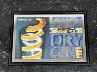 Este es un cuadro vintage con un diseño llamativo. - Presenta una imagen de cáscara de limón en espiral. - Incluye texto Tornado Dry y Gin Dry Larios.