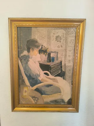 Precioso cuadro antiguo con un estilo vintage. Representa a una mujer sentada en un sillón, con un fondo decorado. - Marco dorado con detalles. - Pintura al óleo sobre lienzo. -Medidas de alto 83 -De ancho 63
