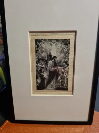 Estampa religiosa enmarcada. Recuerdo Primera Comunión, 1926. Marco negro. Passepartout blanco. Medidas en las fotos