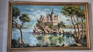 Pintura al óleo de un castillo en una isla rodeada de agua, con árboles y montañas al fondo. La obra está firmada por C. Alfaro. - Pintura al óleo. - Marco dorado incluido. - Representación de un castillo. - Paisaje de lago y montañas.
