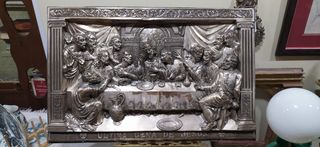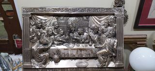 Antiguo cuadro realizado en cobre repujado bañado en plata . Representación de la última cena de Jesús.