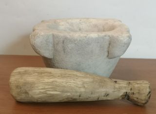 Mortero de mármol, antiguo, siglo XVII / XIX, de farmacia, con mazo en madera de la época. Medidas: 22 cm. diámetro de la boca por 12 cm. de alto, y 9 cm. cm. diámetro base.