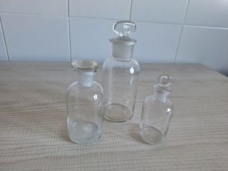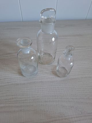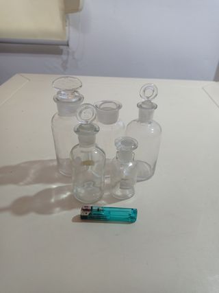 lote 5 botes de cristal farmacia o química con tapones de cristal distintas medidas