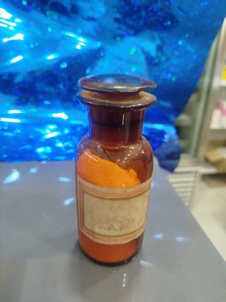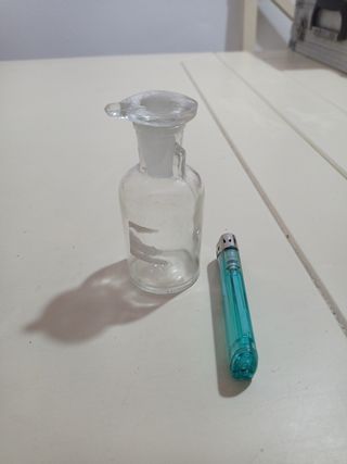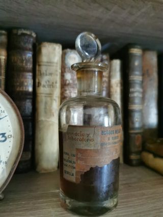 Antigua botella de farmacia con tapón de esmerilado. Procedente de una botica de principios del siglo XX. Se encuentra en buen estado de conservación para su edad, aunque presenta señales del paso del tiempo. - Botella de vidrio transparente. - Tapón de vidrio esmerilado. - Etiqueta antigua parcialmente legible.