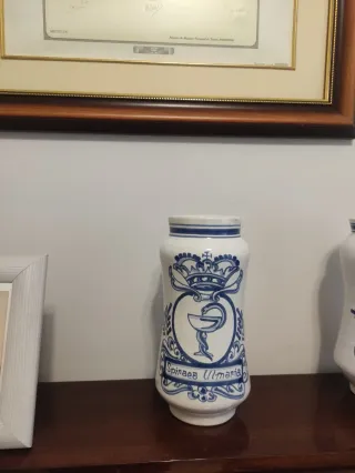 Precioso albarelo antiguo de cerámica con un diseño clásico. Resto de una farmacia. - Altura de 23 cm. - Decoración en azul con motivos florales y heráldicos. - Inscripción Spinae Ulmania en la banda central. La Spinae ulmania es la llamada aspirina natural, pues es una planta perenne rica en ácido acetil salicílico.