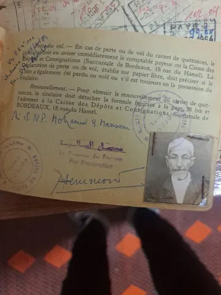 Conjunto de documentos administrativos franceses antiguos. Incluye un carnet de quittances y otros papeles relacionados con trámites financieros. - Carnet de quittances con instrucciones para su renovación. - Documentación con sellos y firmas oficiales. - Incluye una fotografía de un hombre mayor.