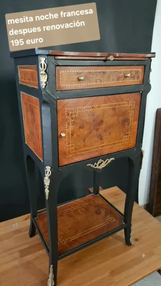 Mesilla francesa de madera con marquetería original. Pieza trabajada artesanalmente y lista para usar: limpia, protegida y con herrajes originales. Interior renovado y práctico para el día a día. No es un mueble industrial. Es una pieza única con carácter que normalmente se vende mucho más cara; simplemente necesito liberar espacio. Ideal para dormitorio o recibidor. Se puede usar desde hoy. Precio muy ajustado para lo que es. Recogida en persona.