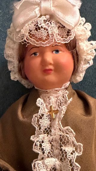 Pequeña muñeca antigua, se cree que es de origen francés. Viste un traje de cuadros azules y blancos con un delantal. - Gorro a juego con el traje. - Medias blancas y zapatos blancos.