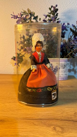 Muñeca coleccionable vestida con un traje regional típico francés. Traje tradicional con cofia blanca, blusa con cruz, y falda con motivos florales. Se encuentra protegida dentro de su embalaje original.