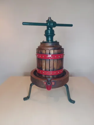 Exclusiva prensa artesanal francesa de Le Châtelet-en-Brie (h. 1920). Restauración profesional nivel museo: madera noble pulida y nutrida con aceite de linaza (máxima protección y resalte de veta). Ficha Técnica: Capacidad: 2,74 Litros (Ideal micro-vinificación/esencias). Medidas: 48 cm altura. Base 25x5,5 cm. Jaula 15x15,5 cm. Peso: 6.005 gr. Acabados: Mecánica en Verde Carruaje, anillos en Rojo Burdeos y tornillería en dorado niquelado. Jaula desmontable para fácil limpieza. Pieza totalmente operativa y de gran valor decorativo. Una pieza excepcional para coleccionistas exigentes o como elemento de alta decoración en bodegas