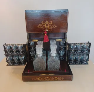 PIEZA DE ALTA ÉPOCA (c. 1850-1860): Soberbia licorera francesa original del periodo Napoleón III. Objeto de gran lujo restaurado con 7 capas de barniz a muñequilla, técnica que realza su impecable marquetería de nácar, madreperla y latón. Presenta un sofisticado sistema de apertura lateral panorámica. Incluye cerradura y llave operativas. Cristalería: 4 botellas cuadradas talladas y 16 copas a juego (algunas piezas renovadas por su uso histórico). Dimensiones: Cerrada 32,5 x 24 x 26 cm. Abierta 62 x 28 x 44 cm. Peso: 4,2 kg. Se garantiza embalaje profesional de máxima seguridad para envíos nacionales e internacionales.
