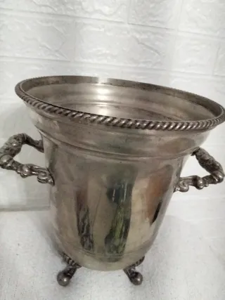 Elegante champanera de alpaca con baño de plata, de origen francés y datada del siglo XX. Presenta un diseño clásico con asas decorativas y un borde trenzado. - Material: Alpaca con baño de plata. - Origen: Francia. - Época: Siglo XX. - Detalles: Asas ornamentadas y borde trenzado.