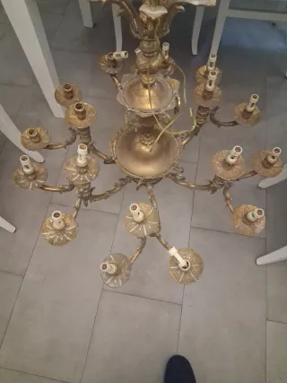Elegante lámpara de bronce con un diseño clásico y detallado. Aporta un toque de distinción a cualquier espacio.Tiene seis brazos y 18 lamparas requiere alguna reforma. - Material: Bronce - Estilo: Clásico - Acabado: Dorado