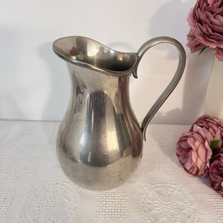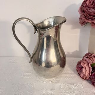 Jarra clásica de metalistería europea. • Jarra clásica de metalistería europea. Según las marcas que se aprecian en la base, aquí tienes una descripción detallada y una estimación de su valor: Descripción de la Pieza • Material: Estaño (marcado como "ETAIN" en francés). El acabado es pulido, lo que le da ese brillo similar a la plata, pero con el tono más cálido y suave característico del estaño. • Origen: El sello con la palabra "ETAIN" y los punzones (logotipos grabados) sugieren una fabricación francesa o belga. El punzón superior parece ser una representación de una corona o un escudo de armas, común en las manufac