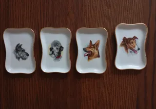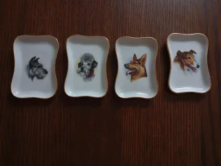 Conjunto de cuatro platos de porcelana antiguos con motivos de perros. - Diseño francés. - Borde dorado. - Cada plato presenta una raza de perro diferente.