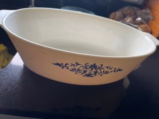 Bandeja de porcelana antigua con un bonito diseño floral en azul. Es ovalada y cuenta con asas. - Material: Porcelana. - Color: Blanco con detalles en azul. - Forma: Ovalada. - Asas laterales.